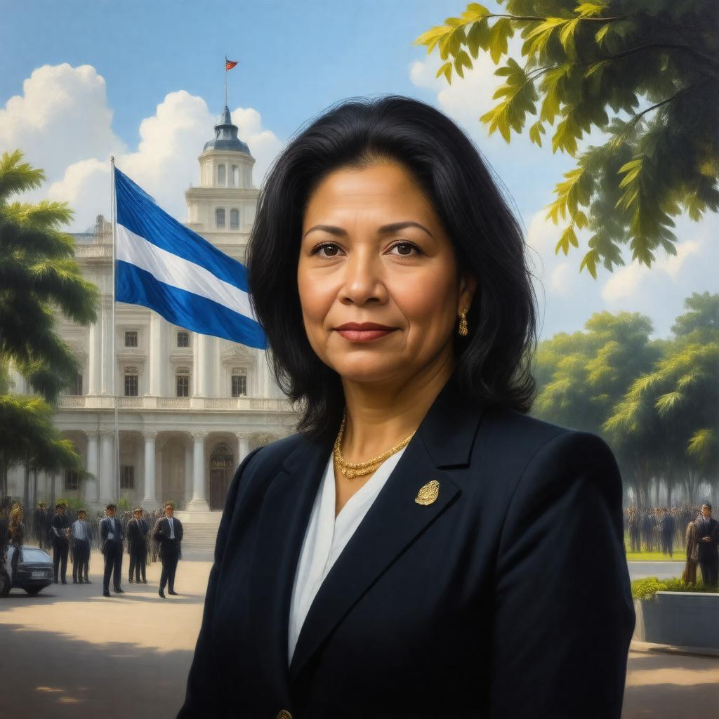 Create a realistic portrait of Xiomara Castro, the first female President of Honduras, standing in front of the Presidential Palace of Honduras, wearing formal attire and a confident expression, with the Honduran flag subtly visible in the background, in a style that reflects her dignified and authoritative presence as a prominent politician and leader.