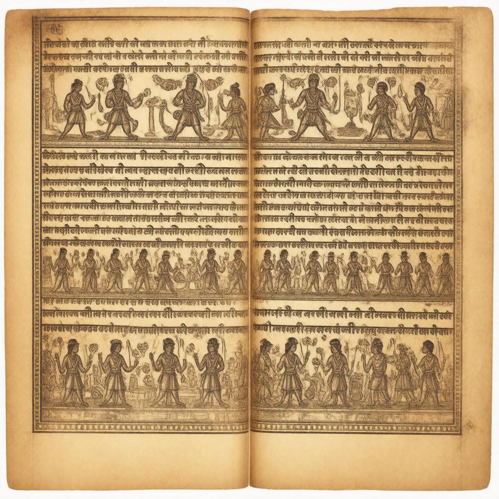 "Generate an image of an ancient Indian manuscript page, written in Sanskrit, featuring intricate illustrations of ritual sacrifice and yajna, with a background of yellowed parchment and ornate Vedic symbols, representing the Yajurveda, a core Hindu scripture and part of the Vedas, with a focus on ritual and sacrificial rites."