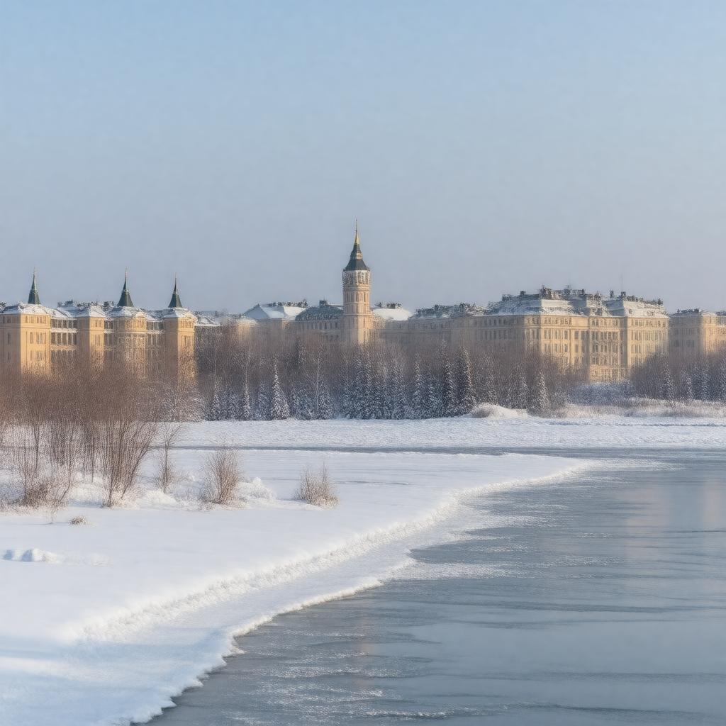 "Generate a realistic winter image of Yakutsk, the capital city of the Sakha Republic in Russia, showcasing its snowy landscape and frozen Lena River, with traditional Russian and Sakha architecture in the background, under the cold subarctic climate, with a temperature possibly reflecting its reputation as the coldest major city in the world."