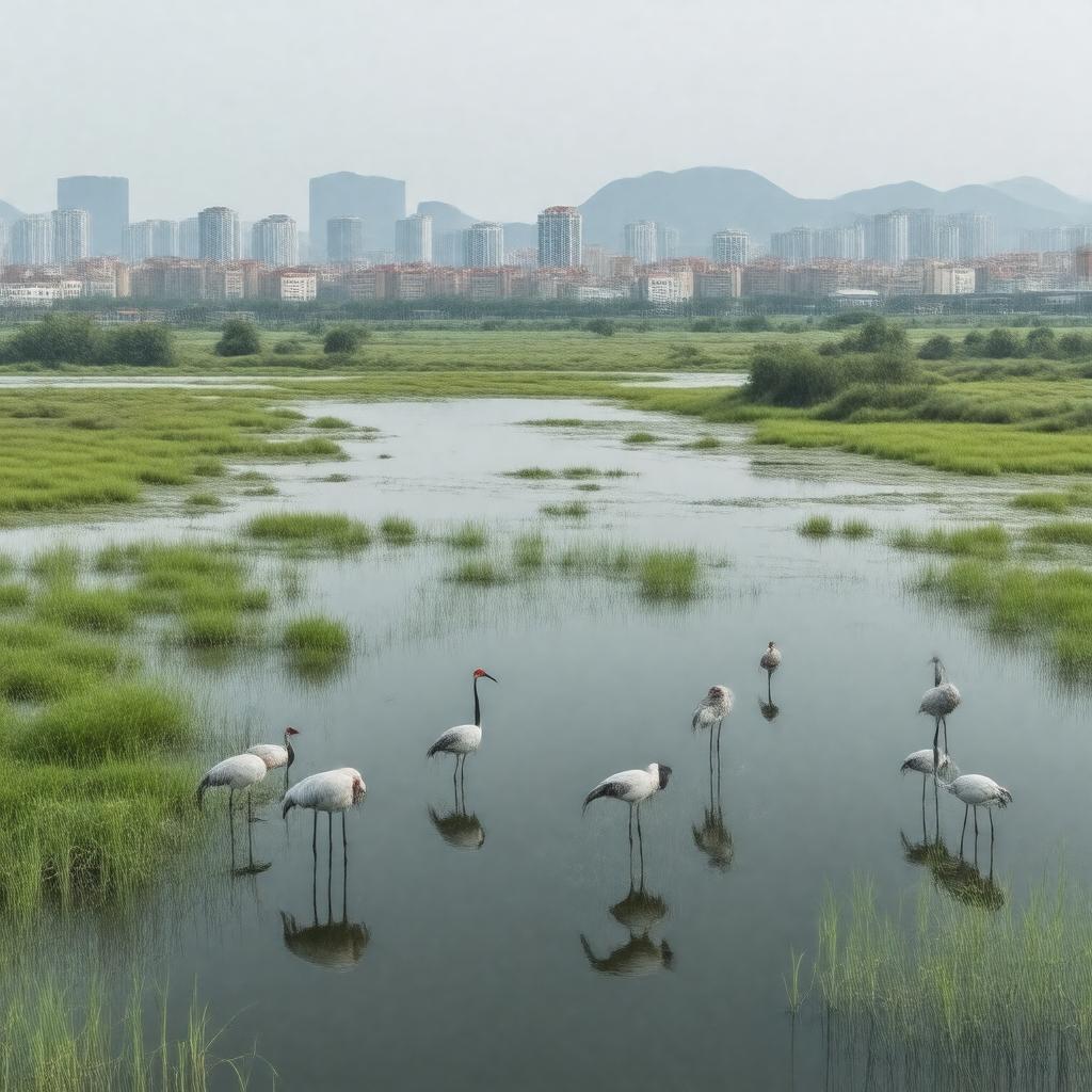 "Generate a realistic image of Yancheng city in Jiangsu Province, China, showcasing its wetlands and possibly featuring the Yancheng National Nature Reserve with red-crowned cranes, set against a backdrop that could include the Yellow Sea coastline, with a mix of urban and natural scenery."