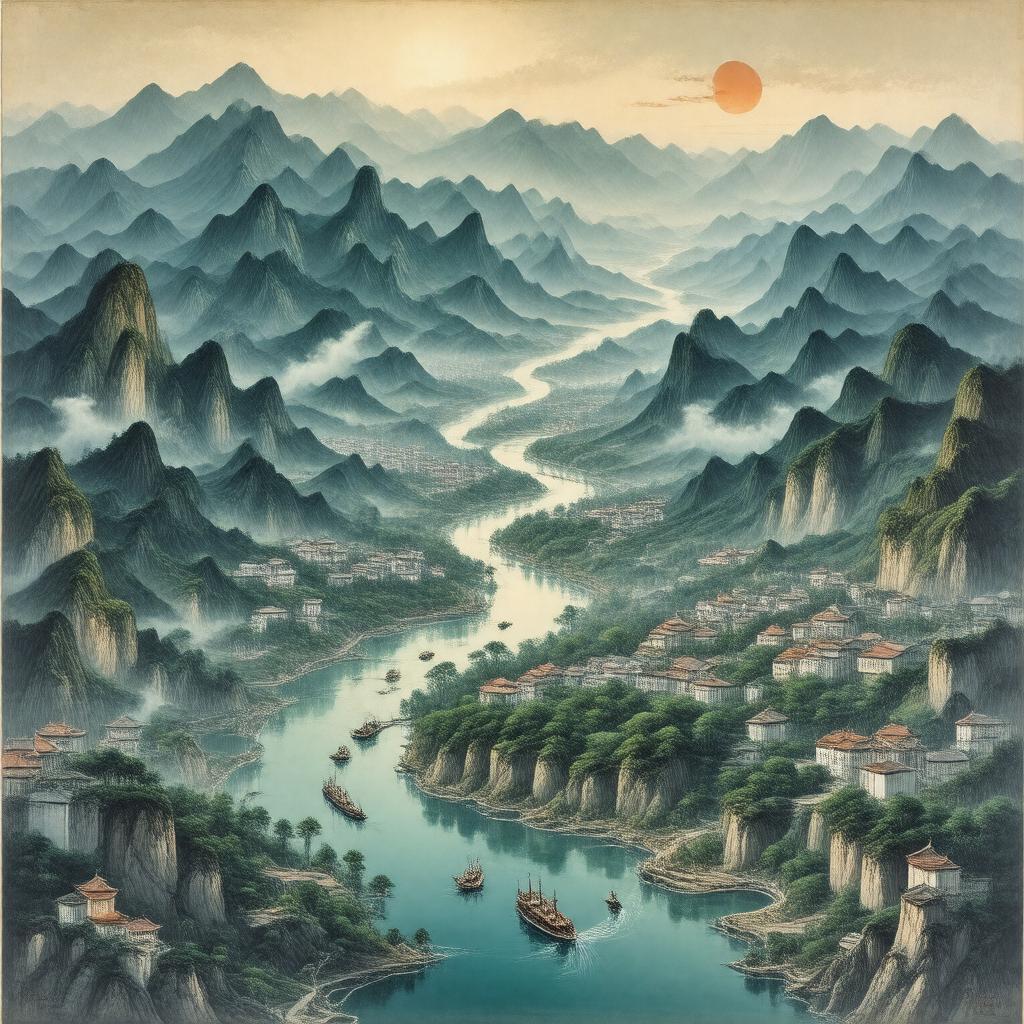 "Generate an image of the Yangtze River, a majestic and serene river flowing through the heart of China, with lush green mountains and misty valleys, showcasing its tranquil beauty and importance as a major transportation route, hydroelectric power source, and cradle of ancient Chinese civilization; include iconic landmarks such as the Three Gorges Dam, Tiger Leaping Gorge, and Yangtze River Delta; style: a breathtaking landscape painting with soft brushstrokes and vibrant colors, evoking a sense of awe and wonder."