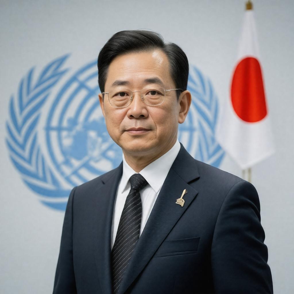 "Generate a realistic image of Yukio Takasu, a middle-aged Japanese diplomat, in a formal suit, standing in front of the United Nations logo, representing his role as United Nations Under-Secretary-General for Management, with a subtle Japanese flag in the background, in a style that conveys professionalism and diplomacy."