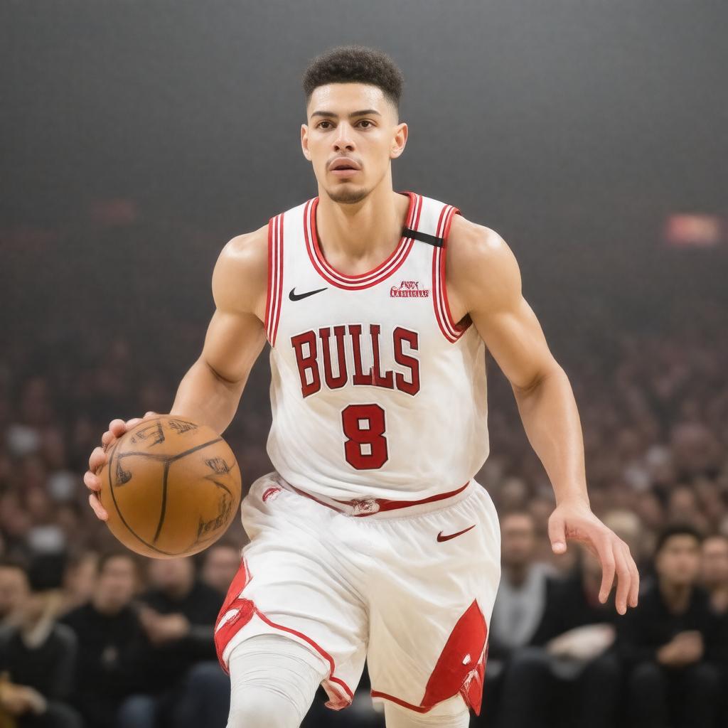 Generate a realistic image of Zach LaVine, a professional American basketball player, in his Chicago Bulls uniform, mid-game, with a dynamic and athletic pose, showcasing his skills as a shooting guard and point guard, with a bold and confident expression, set against a blurred background of a packed stadium, in a photorealistic style.