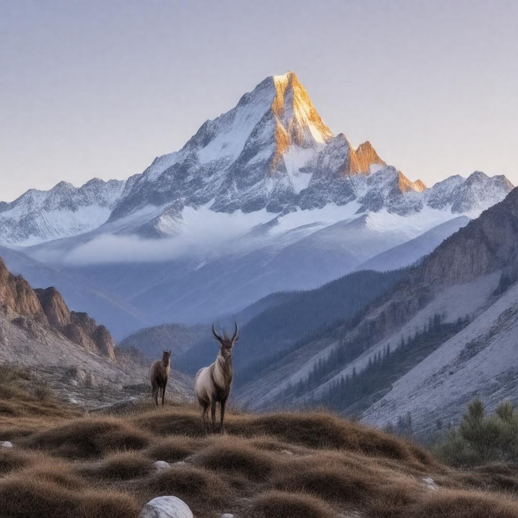 "Generate an image of a majestic mountain range stretching across a vast landscape, with rugged peaks and valleys, snow-capped summits, and lush oak forests. In the distance, a few wild goats and leopards roam freely. The sun is setting, casting a warm orange glow over the scene. The Zard Kuh peak stands prominent, with its 4,548 meters height towering above the rest. The image should convey a sense of grandeur, serenity, and natural beauty, showcasing the Zagros Mountains in all their glory. Style: realistic landscape photography."