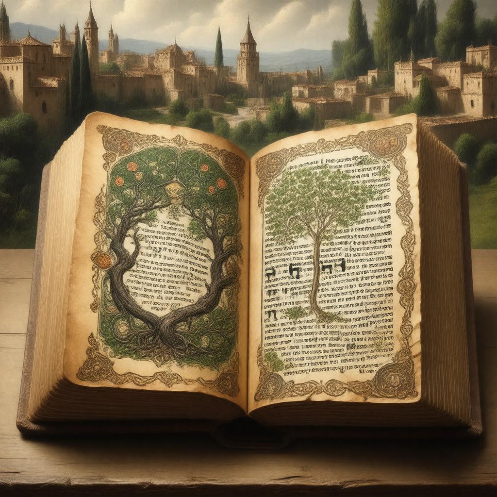 "Generate an image of an open book with yellowed pages, written in Aramaic and Hebrew, with intricate illustrations and mystical symbols, representing the Zohar, a central work of Kabbalah, with a subtle background of a medieval Spanish cityscape, signifying its country of origin, and a hint of a Kabbalistic tree of life, reflecting its significance in Jewish mysticism and Orthodox Judaism."