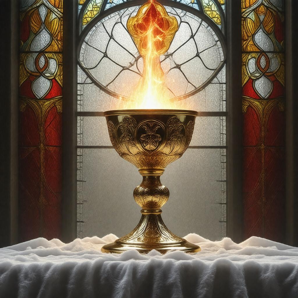 "Generate an image of a chalice with a glowing red liquid, surrounded by ornate golden details and adorned with a white cloth, set against a backdrop of a Gothic-style stained glass window, representing the Blood of Christ in a Eucharistic adoration context."