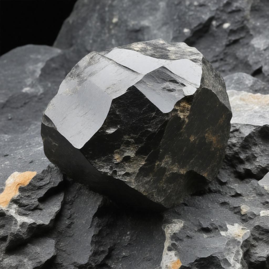 "Generate an image of a chunk of chromite, an oxide mineral, with a metallic luster and a black to brownish-black color, embedded in a matrix of olivine and serpentine, with a rough, granular texture, set against a backdrop of a layered mafic intrusion, with a subtle hint of platinum and magnetite in the surrounding rocks, in a realistic and detailed style."