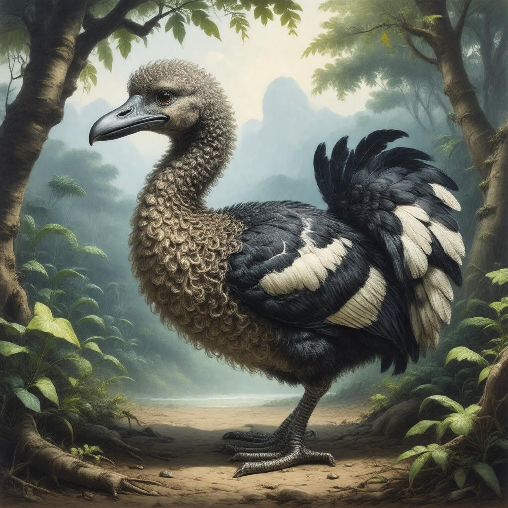 "Generate an image of a dodo, a large, plump bird with a distinctive curly tail, small wings, and a large beak, standing in a forest on the island of Mauritius, in a realistic style reminiscent of 17th-century natural history illustrations, with a subtle hint of melancholy to convey its status as a symbol of extinction."