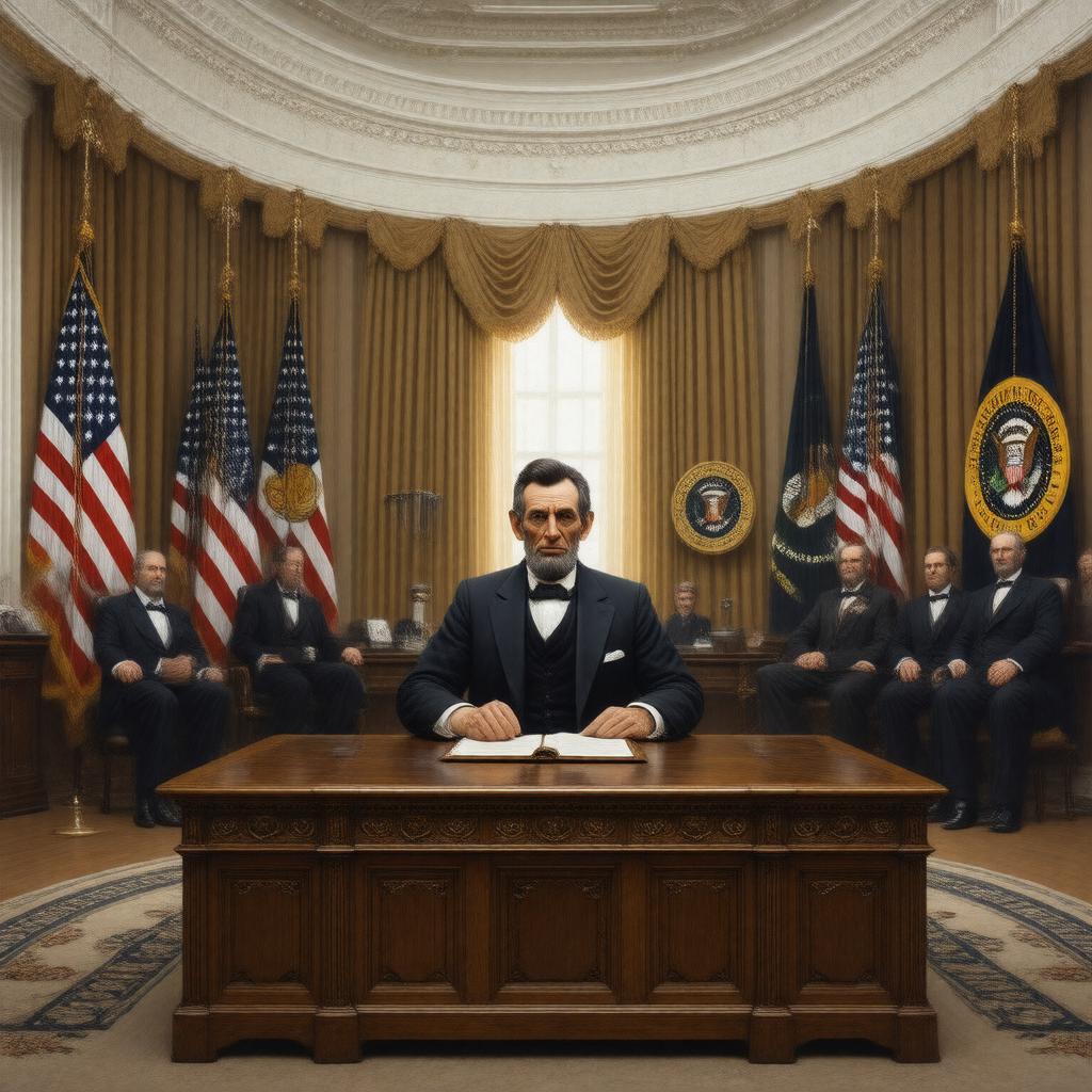 "Generate an image of a stately portrait of the Oval Office in the White House, with a large desk in the center, and a stern yet determined expression of Abraham Lincoln sitting behind it, with a backdrop of American flags and a seal of the President of the United States, representing his presidency from 1861 to 1865, with a mix of serious and iconic elements reflecting his leadership during the American Civil War and notable events such as the Emancipation Proclamation and Gettysburg Address, in a realistic and solemn style."
