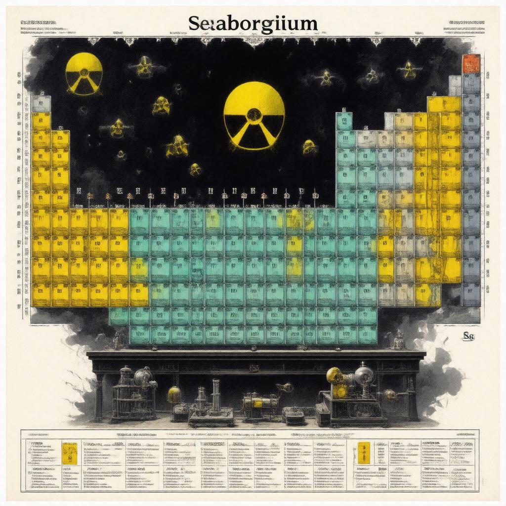 "Generate an image of a periodic table with seaborgium (Sg, atomic number 106) highlighted, surrounded by a dark, ominous background with subtle radiation symbols, representing its radioactive and synthetic nature as a transition metal in the d-block, with a faint laboratory equipment in the background, symbolizing its discovery at Lawrence Berkeley National Laboratory."