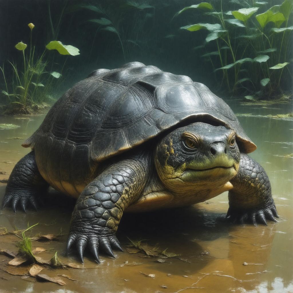 "Generate an image of a large, rough-shelled snapping turtle, specifically Chelydra serpentina, with a powerful jaw and aggressive expression, in a freshwater habitat in North America, surrounded by aquatic plants and with a nocturnal atmosphere, in a realistic style."