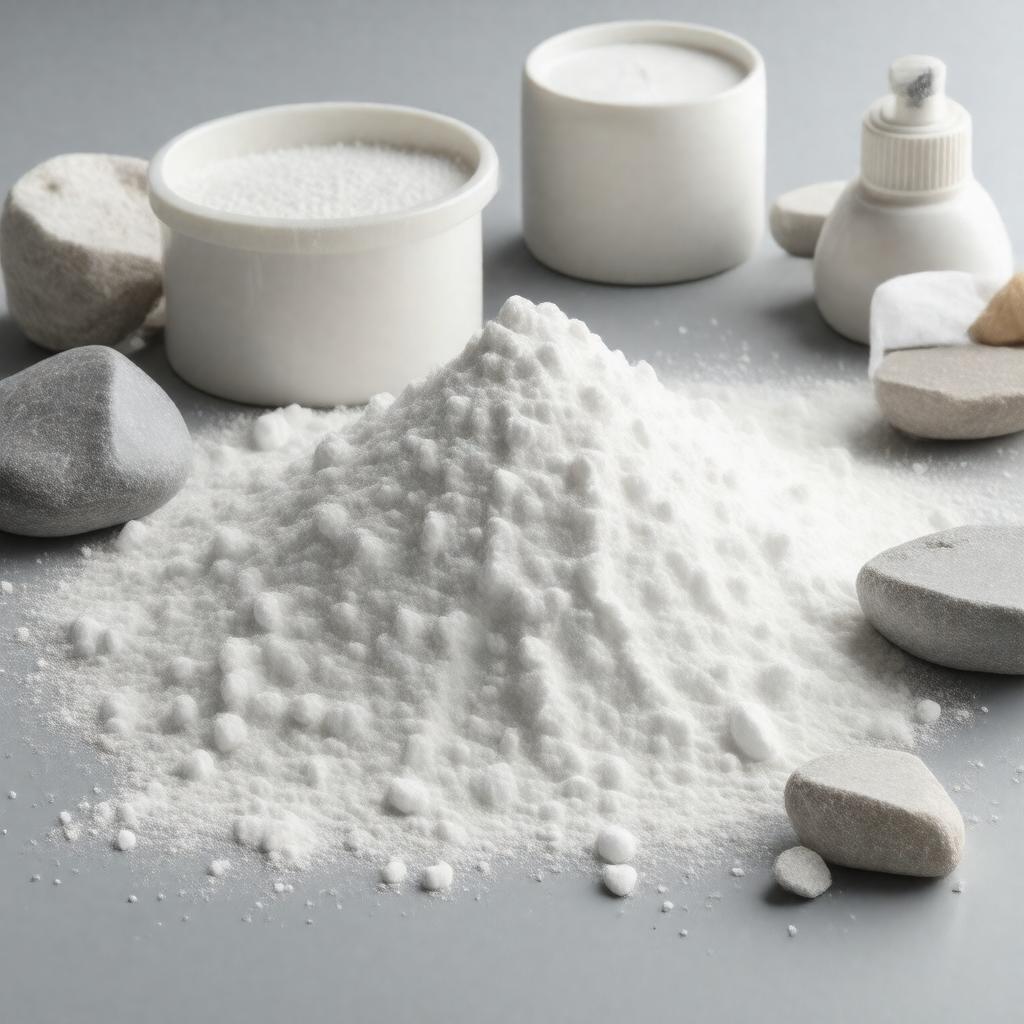 "A pile of soft, white talc powder with a few lumps of steatite, also known as soapstone, in the background, surrounded by various cosmetic products such as baby powder, moisturizer, and ceramics, rendered in a realistic and detailed style with a subtle pearly sheen."